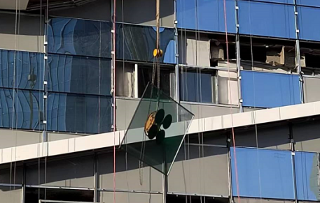 京東超級體驗店是在原有的東購舊址上改造而成的,里里外外都需要裝修一番,外墻上采用了當下先進的玻璃幕墻結構,施工時先由大型起重機利用超長的吊臂把玻璃幕墻移動到安裝工人身旁,和其他吊運工作不同的是,幕墻玻璃安裝要求極其嚴格,不能有絲毫差錯,不僅注意安全,還要注意角度和高度問題。